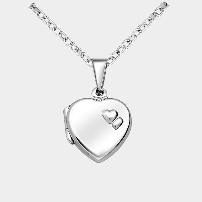 Clara is a small, delicate heart-shaped locket with a tiny heart embellishment on the front. This locket would make the perfect gift for a little girl or young lady to hold two precious photos.